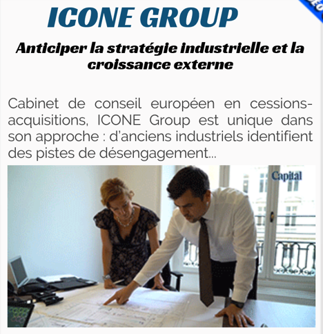 ICONE Group est un cabinet de conseil en cessions-acquisitions, avec une spécialisation dans les "Reconversions Industrielles". Issu d'un partenariat de plusieurs anciens industriels et experts en conseil industriel, le cabinet est implanté à Paris, et dispose d'un réseau de partenaires (anciens industriels et investisseurs) très compétents à l'international.